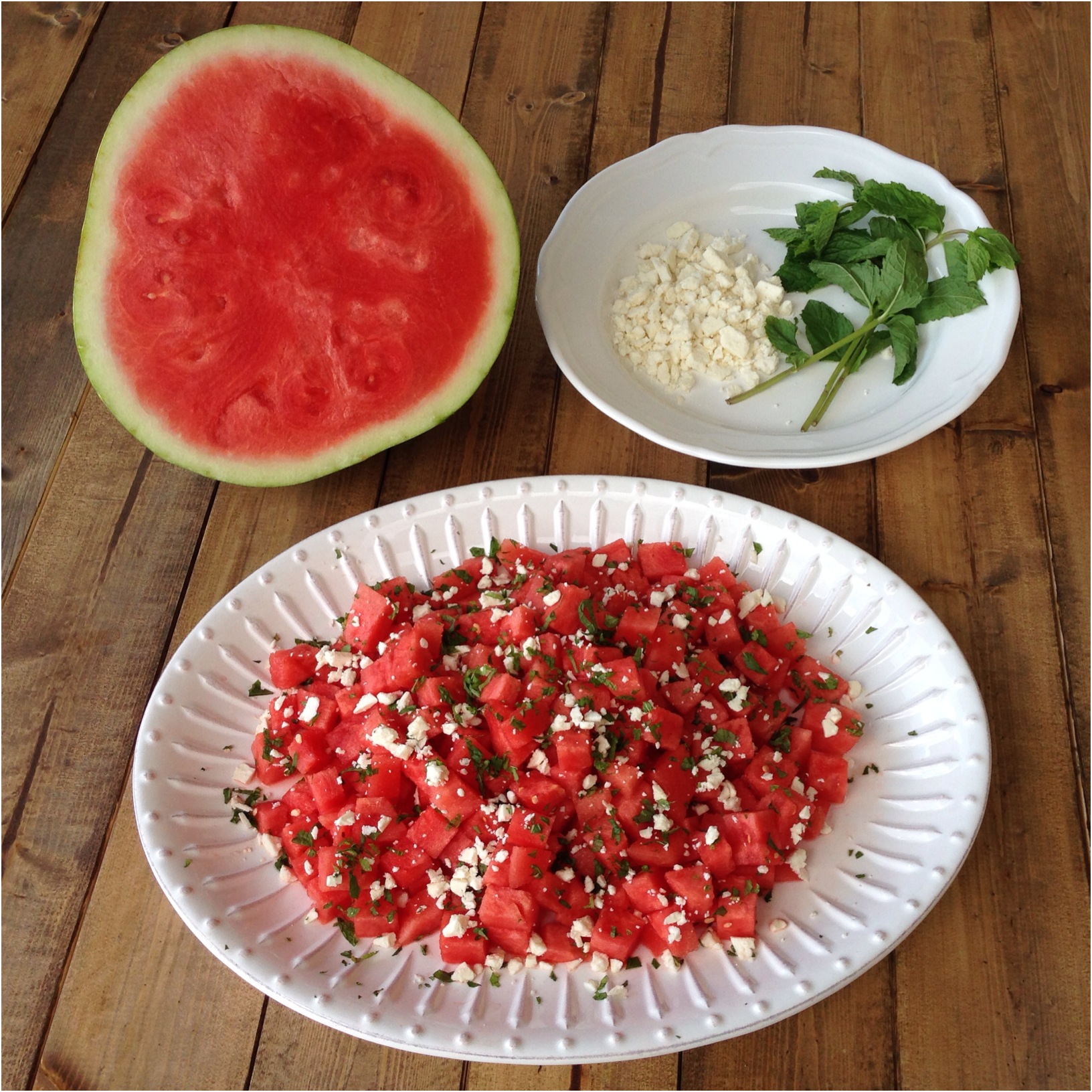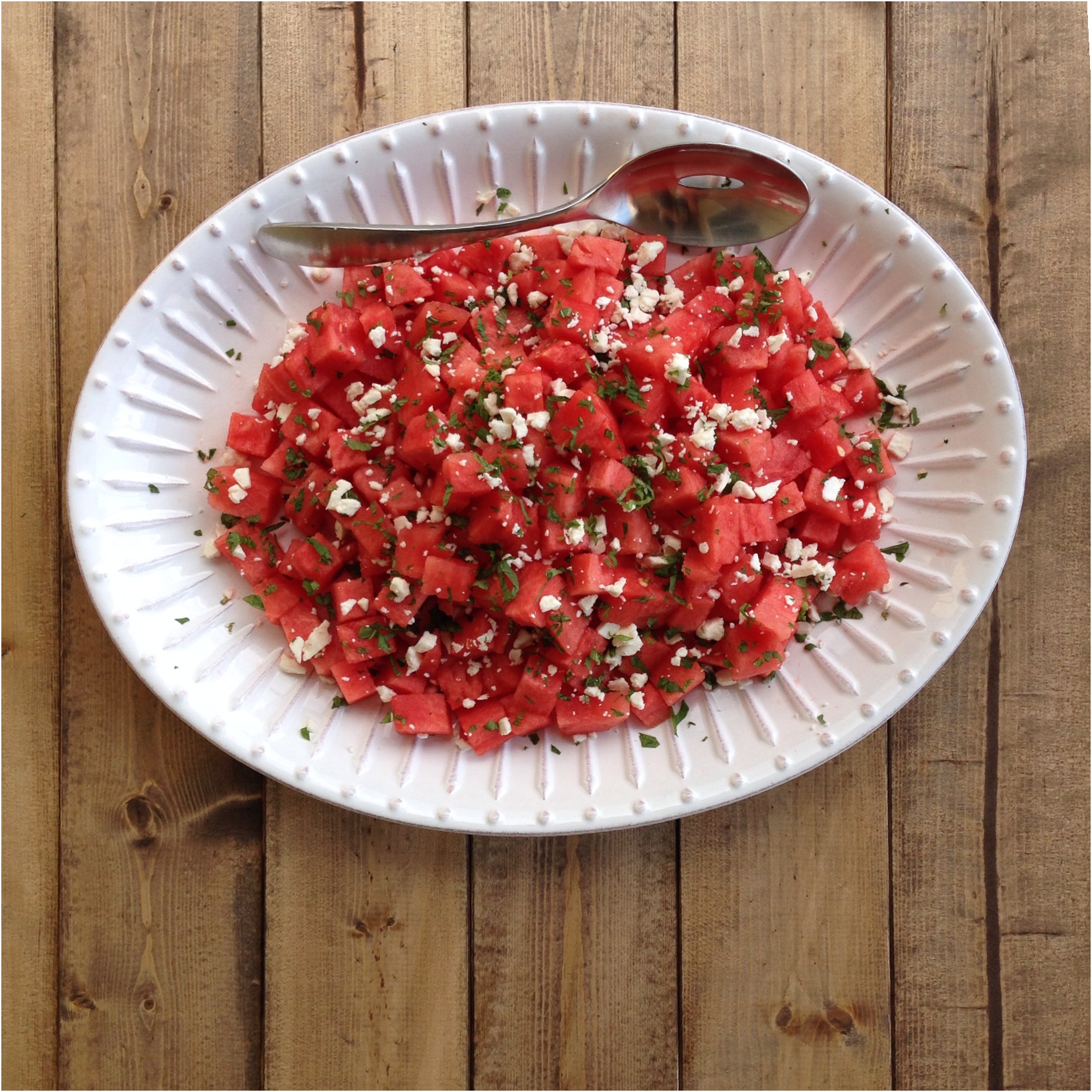 As fall draws near, I am clinging to the last remnants of summer and summertime salads are a big part of that in our home. I’m sure you’ve heard of combining watermelon, feta and mint leaves into a salad. Haven’t we all? Being the watermelon purist that I am, I was hesitant to try it… That is until I needed to throw together an easy side for a neighborhood bbq and happened to have all of the ingredients on hand. I felt like doing more than filling a serving bowl with watermelon cubes. Every recipe I’ve come across includes watermelon, feta, mint leaves and some type of dressing of varying complexities. I opted to make mine without any dressing as Kevin and I agreed the flavors balanced and complimented each other so well that there was no need for any additions. We love this dish. We’ve eaten it nearly every week this summer and our friends are always asking for the recipe. Let’s be clear here…I’m not claiming to have created or discovered this salad…I’m just saying that I choose not to dress mine 🙂 Please see my version (and probably that of a zillion others) below. Make it this weekend! You will love the freshness and brightness that feta and mint bring to a classic, summertime watermelon.